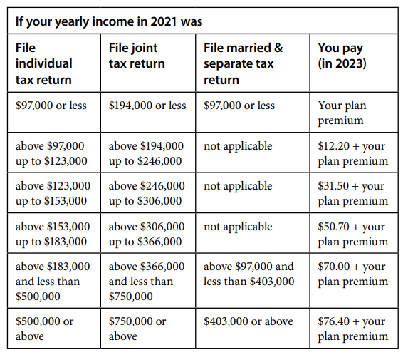 If your modified adjusted gross income as reported on your IRS tax return from 2 years ago is above a certain amount, you'll pay the standard premium amount and an Income Related Monthly Adjustment Amount (IRMAA). IRMAA is an extra charge added to your premium.